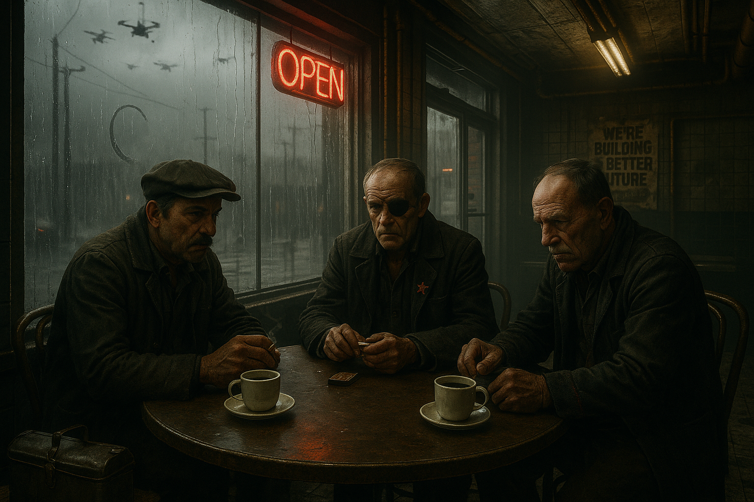 Inside, coffee is axle-grease black, bitter as the unpaid hour the spreadsheet thanked.